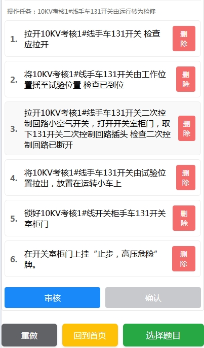 6:在开关室柜门上挂“止步,高压危险”牌。这个需要检测但不要显示到操作票上