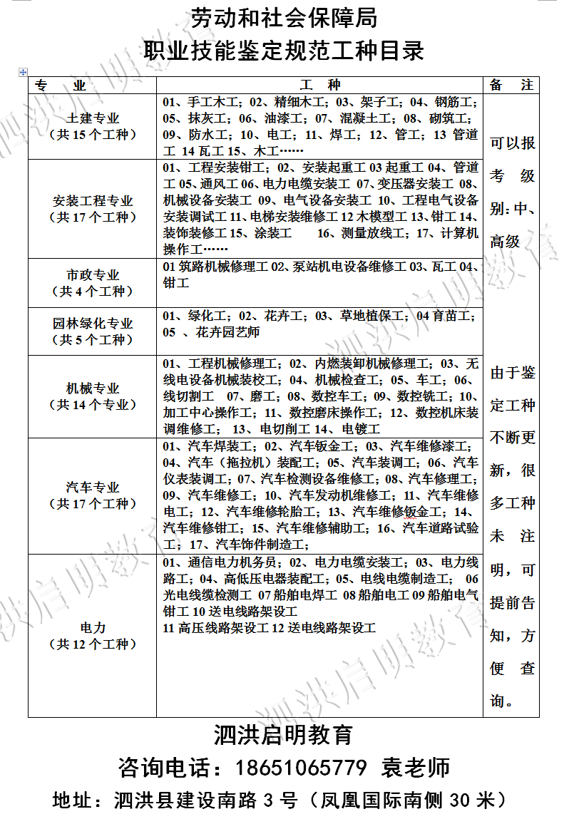 以上只是部分工种截图,如没有可电话咨询:18651065779 袁老师