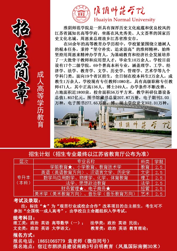 淮阴师范学院2017年成人高考招生简章