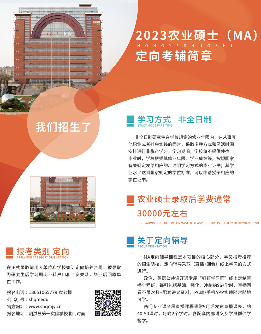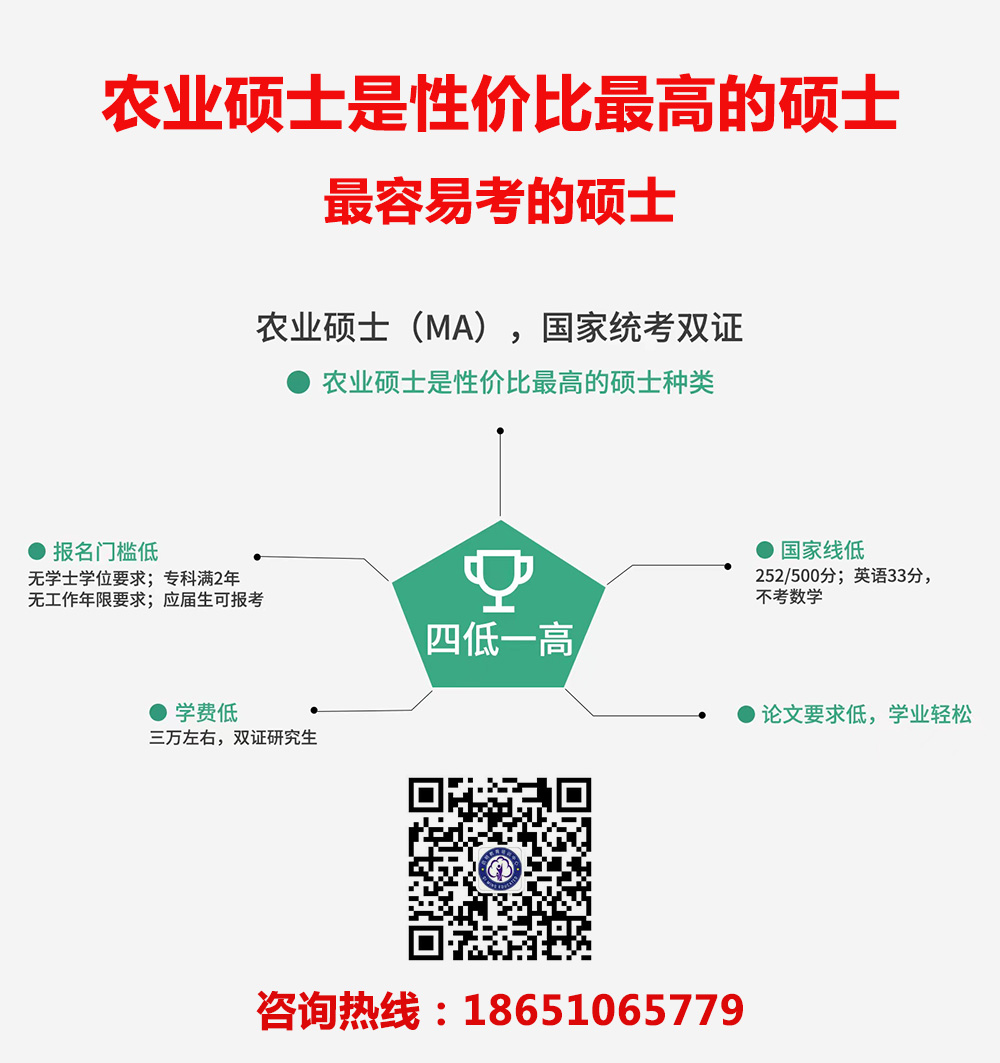 农业硕士(原名:农业推广硕士)是与农业技术推广和农村发展任职资格相联系的专业学位,与相应学科的农学硕士学位处于同一层次。农业硕士专业学位侧重于应用,包括农艺与种业、资源利用与植物保护、畜牧、渔业发展、食品加工与安全、农业工程与信息技术、农业管理、农村发展八个领域,主要为农业技术应用、开发及推广,农村发展,农业教育等企事业单位和管理部门培养具有综合职业技能的应用型、复合型高层次人才。